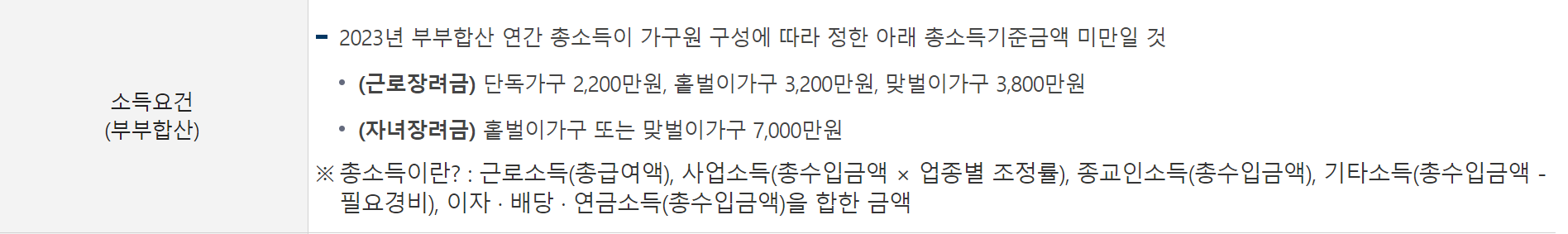 답변 4. 근로장려금의 소득 기준은 가구 유형과 소득 금액에 따라 달라집니다. 현재 단독가구는 연소득이 일정 금액 이하, 외벌이 가구와 맞벌이 가구 역시 상응하는 소득 기준에 부합해야 합니다.