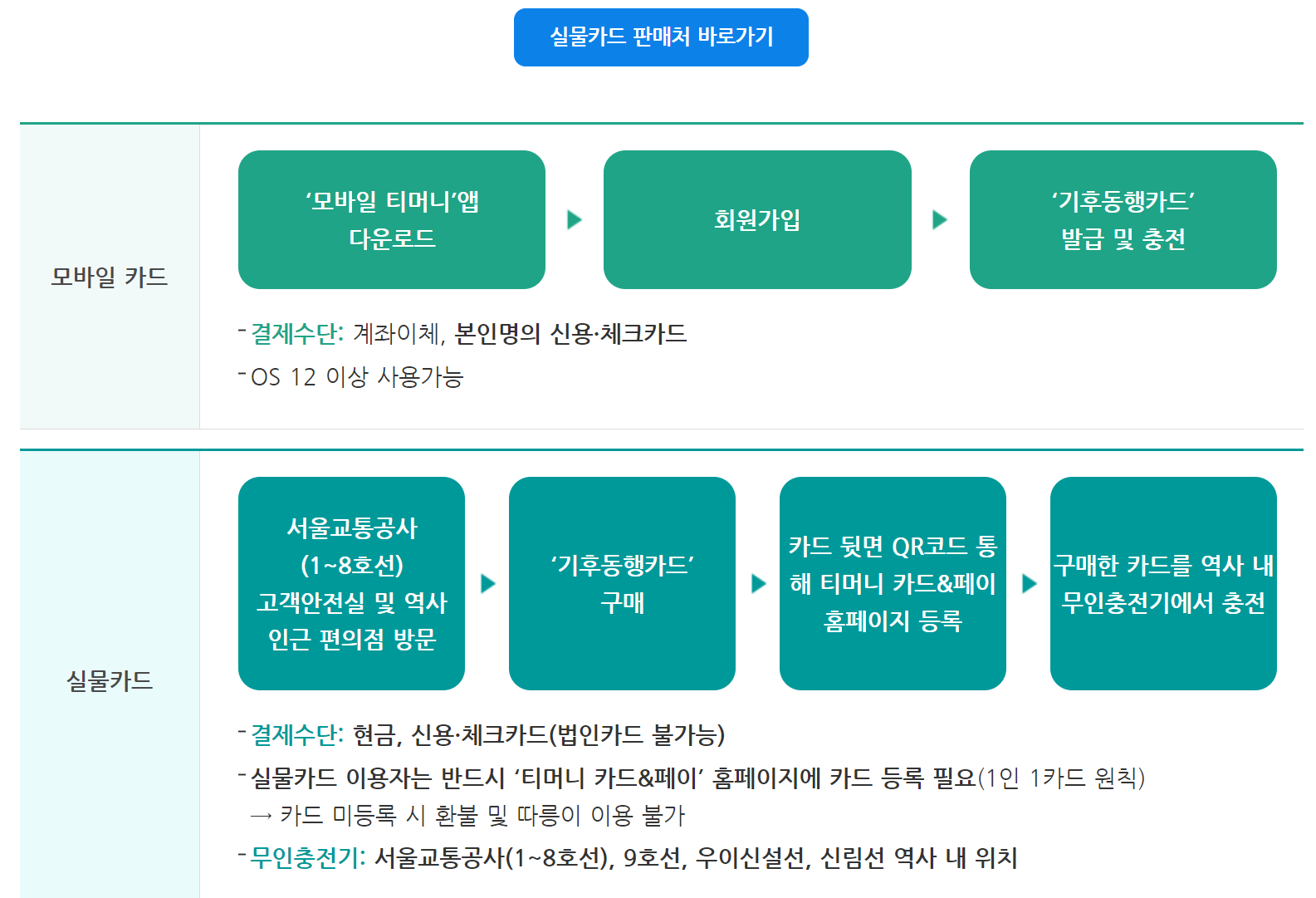 - 실물카드를 사용하는 경우 티머니 홈페이지나 앱에서 충전 가능