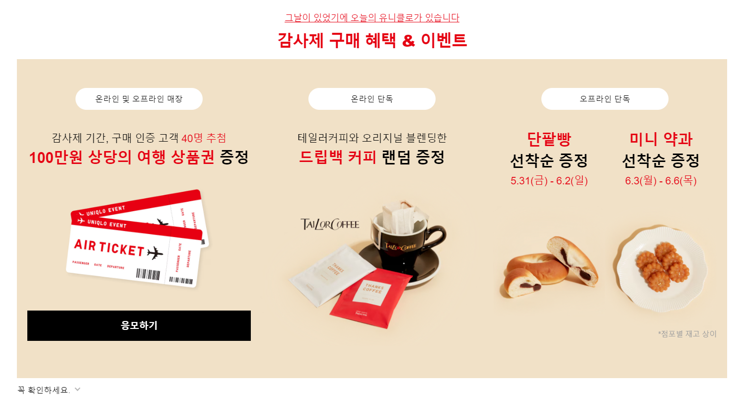 유니클로는 이번 40주년 감사제를 기념하여 다양한 고객 사은 행사를 준비했습니다. 감사제 기간 동안 유니클로 매장에서 제품을 구매하는 고객에게는 선착순 단팥빵과 약과를 증정하는데요.
